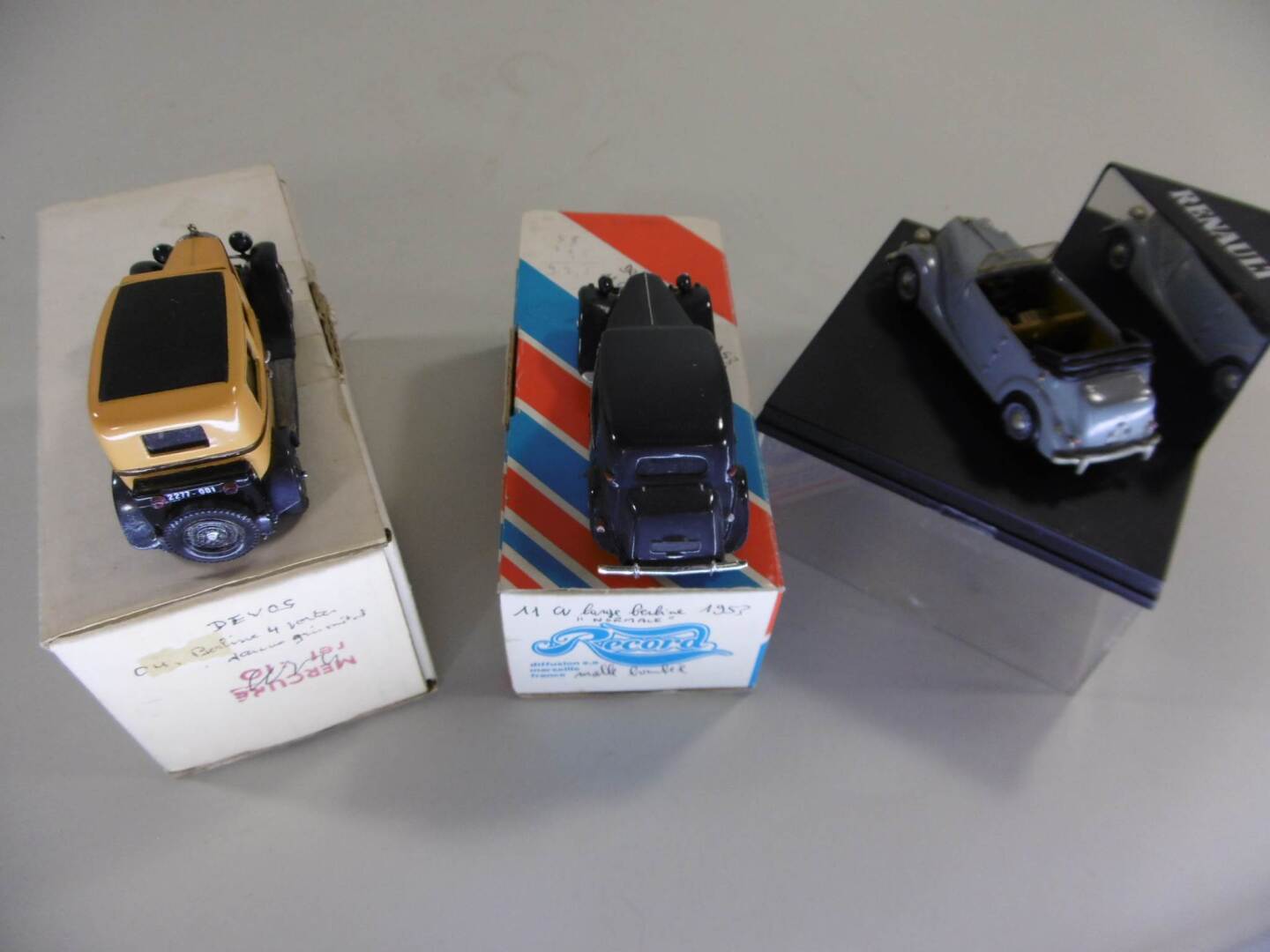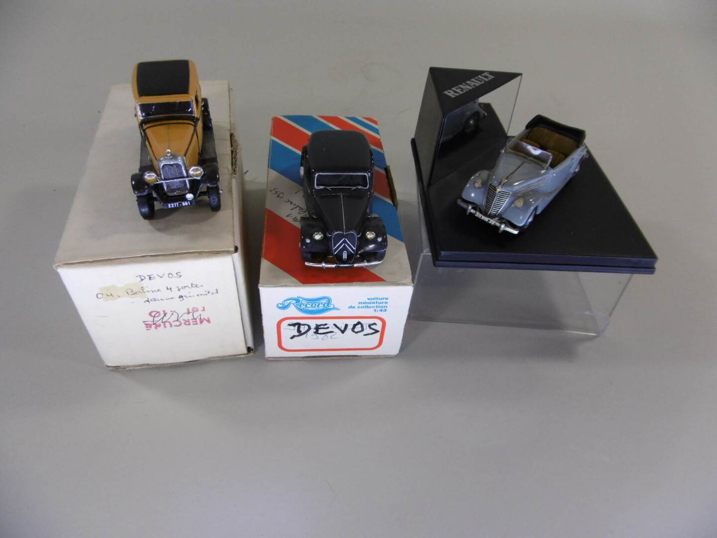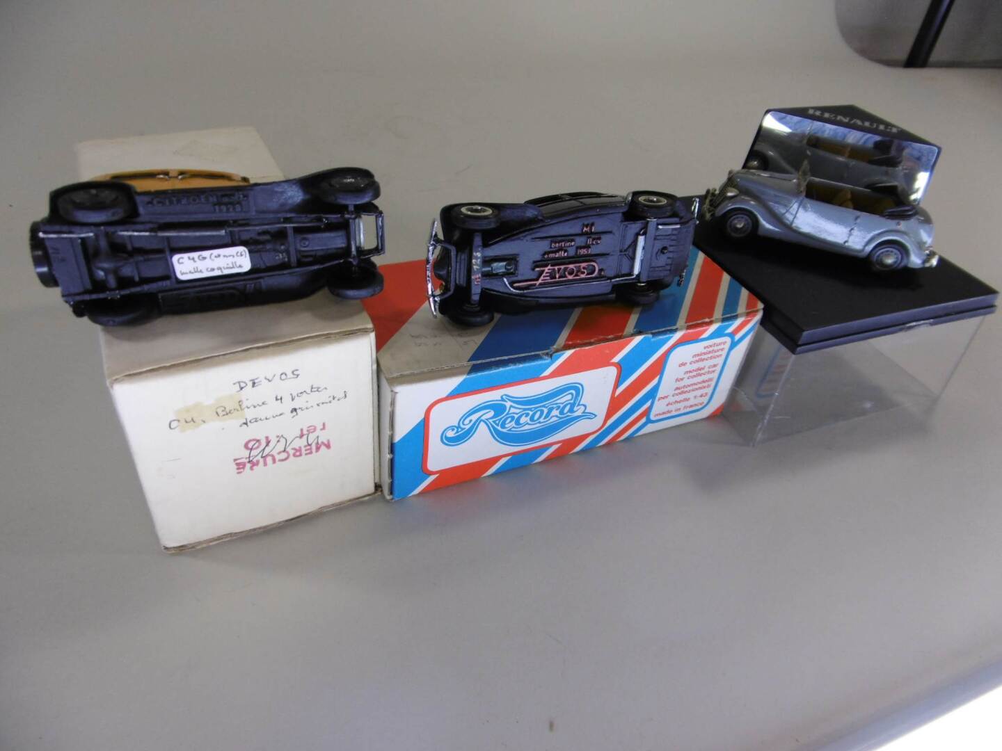 peu courant 2 kits montes devos 1/43° citroen c4 berline 4 portes et traction 11 cv 1953 on y joint 1 renault primaquatre coach 1938 "ma collection" dans boite plexi recente renault tbe