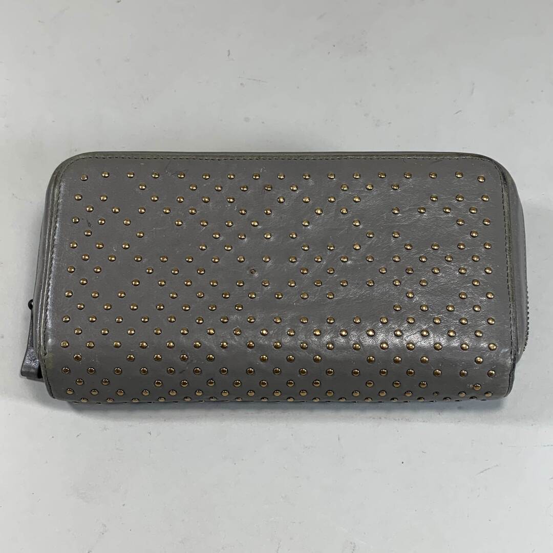 LE TANNEUR : Portefeuille, tout-en-un, compagnon en cuir de couleur taupe ornés de clous mordorés. Fermeture zippée ouvrant sur un portemonnaie centrale, 2x6 porte-cartes et deux poches plaquées. Quelques rayures. Dim. : 22x12x4cm