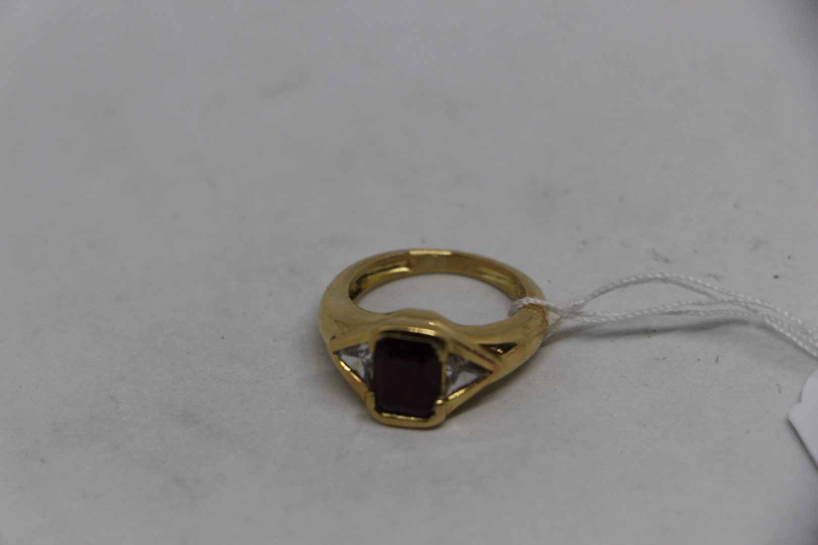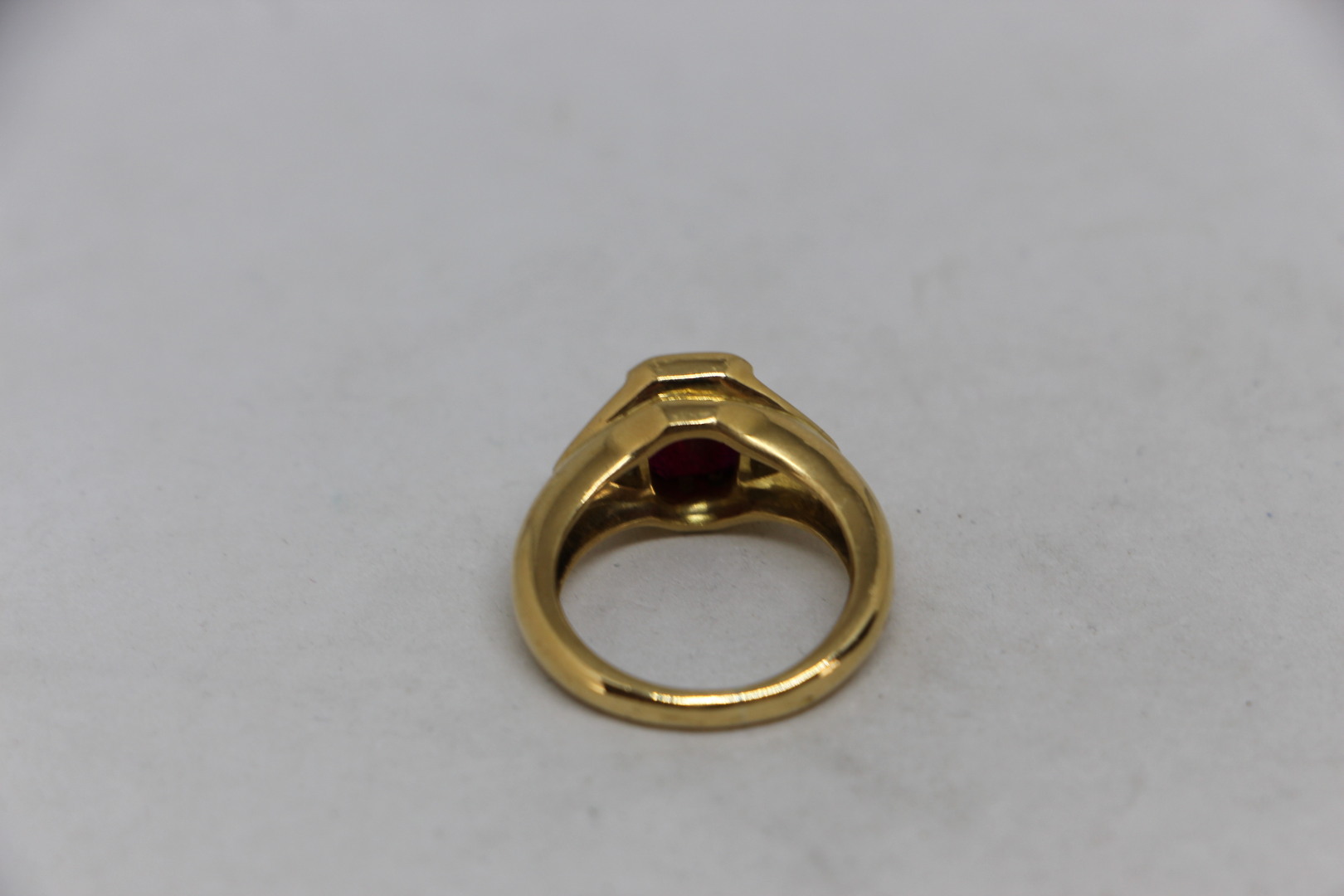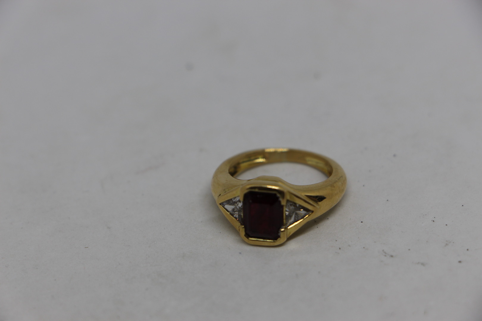 Bague en or 18k sertissant un rubis rectangulaire (8x5 mm) épaulé de 2 diamants trapèzes. 8 gr ER (TDD 52)