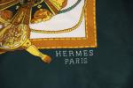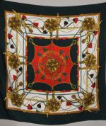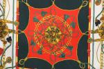 HERMES Paris - carré en soie sur fond rouge et vert à décor de mascarons et de noeuds avec sa boite .