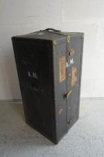 Malle cabine en toile enduite noire de la maison "Malles ELYSEE" chiffrée A.M avec étiquettes...