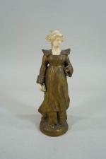 BERNOUD Eugène (XIX-XXème s. ) : Jeune femme bretonne. statuette chryséléphantine en bronze doré et ivoire signée sur la terrasse (accidents main et coiffe) H : 18,5 cm
