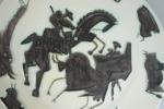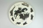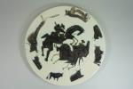 Pablo PICASSO & MADOURA : Scène de tauromachie, grand plat en faïence, tampon Madoura Plein feu empreinte originale de Picasso au dos diam : 45 cm (egrenure)