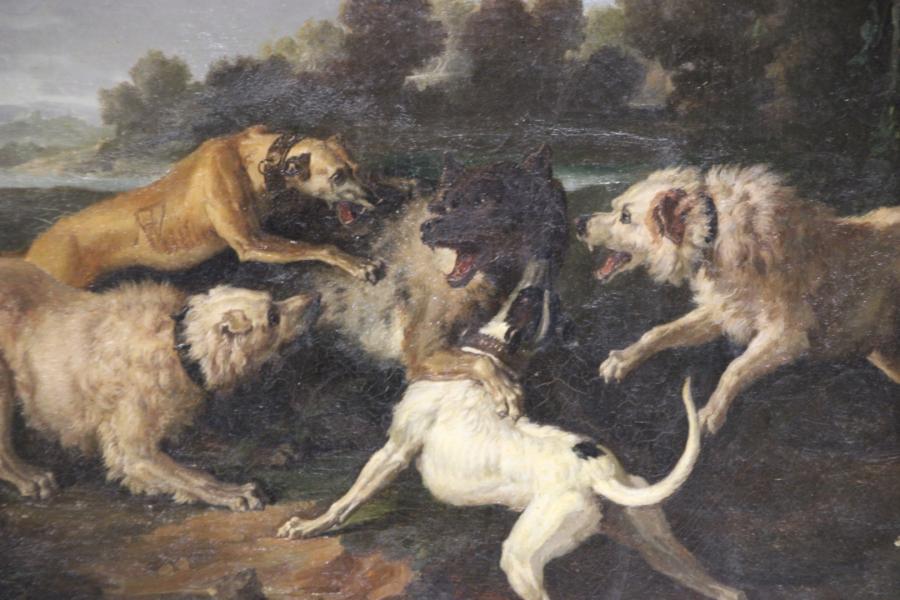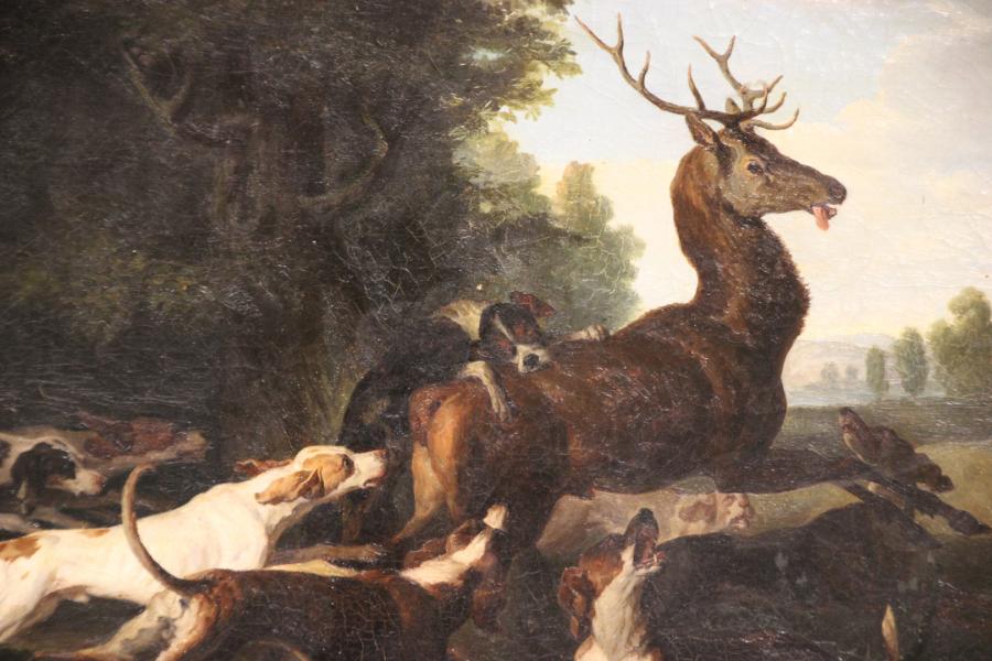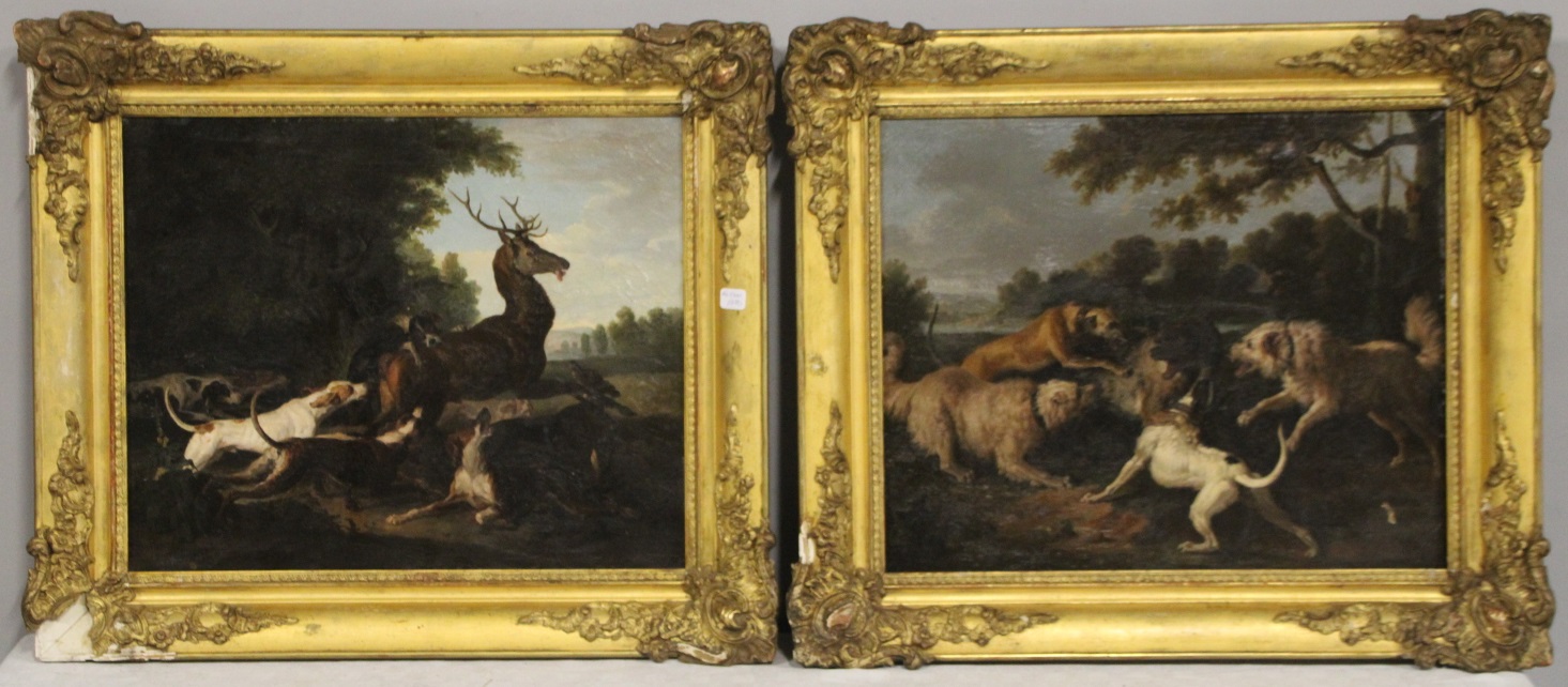 D'après Jacques-Charles OUDRY (1720-1778): "Scènes de chasse" Paire d'huiles sur toile formant pendant. H: 38 cm x 46 cm. (Accidents et craquelures) Signature illisible en bas à droite d'un tableau