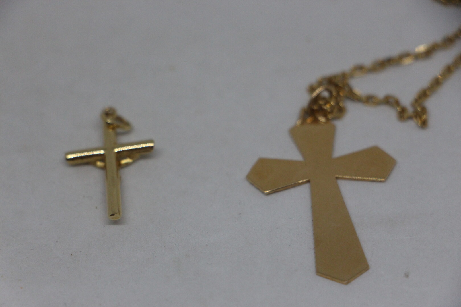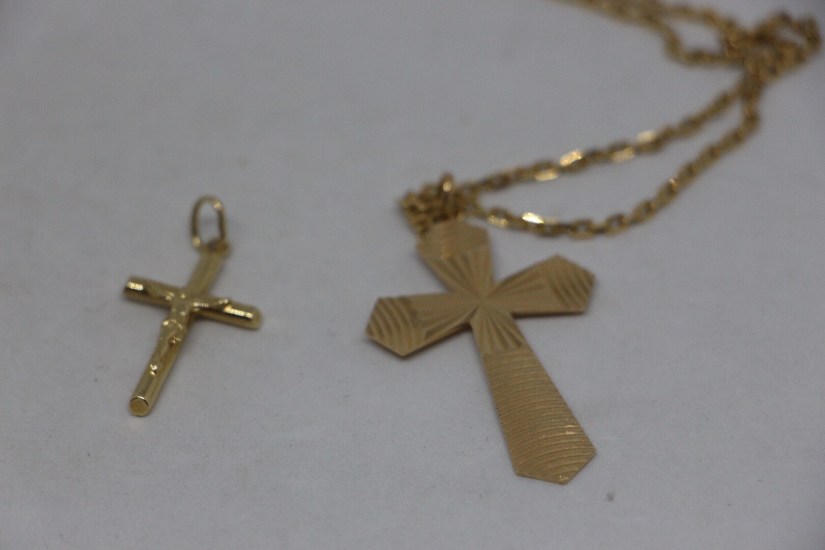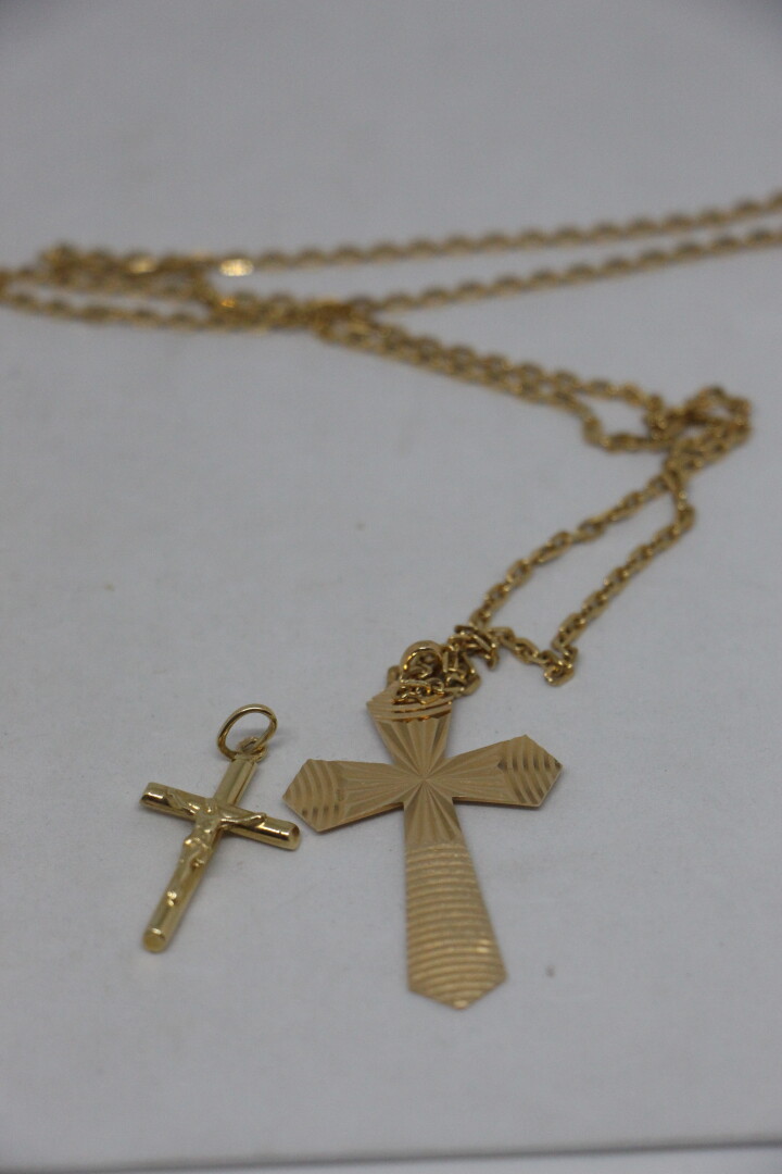 Chaine maillons rectangulaires en or 18k (longueur 55 cm) présentée avec deux croix en or 18k . 12.2 gr ER