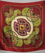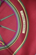 HERMES Paris: Carré en soie "Washington's carriage" Signé "Caty" sur fond bordeaux. H: 90 x 90 cm