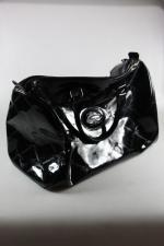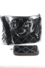 LONGCHAMP - sac porté main et compagnon assortis noirs vernis (35 x 25 cm et 20 x 11 cm) intérieur bleu - très bon état