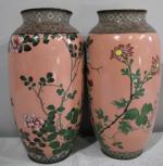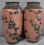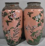 Japon, vers 1900 -Paire de vases cloisonnés à décor de fleurs et de papillons sur fond rose (Eclats et accidents). H: 31 cm