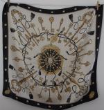 HERMES Paris : Carré de soie " Les clés" sur fond crème et bleu marine, avec sa boite. H: 88 x 88 cm