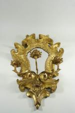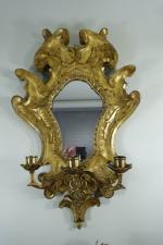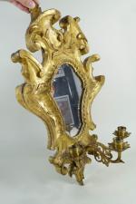 Miroir chantourné en bois doré transformé en applique, à décor de feuillages stylisés, XIXème s. (3 bras de lumière et miroir postérieur) H : 56 cm (fente)
