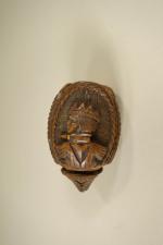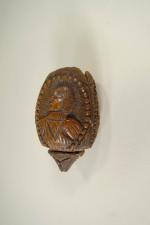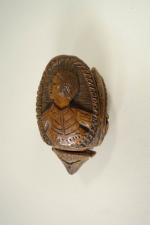 Tabatière dite secouette, probablement en noix de corozo à décor de 3 profils humains dont un couronné, travail "de ponton" ou d'art populaire vers 1800. H : 6,5 cm Expert : M. BACOT