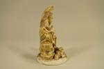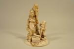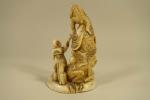 Okimono en ivoire marin représentant Gama-Sennin tenant un rouleau, accompagné de deux crapauds et d'un enfant.