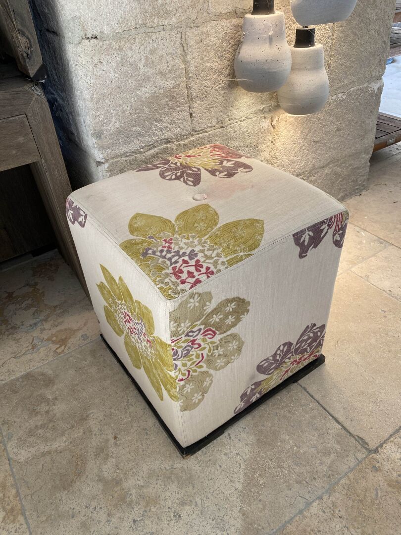 11 poufs cube MAITRE EN SCENE, recouvert de tissu effet lin à motif de pivoines, 38x44cm