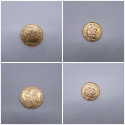 2 pièces de 20 francs or au coq. Poids unitaire : 6.4 g ER (rayées)