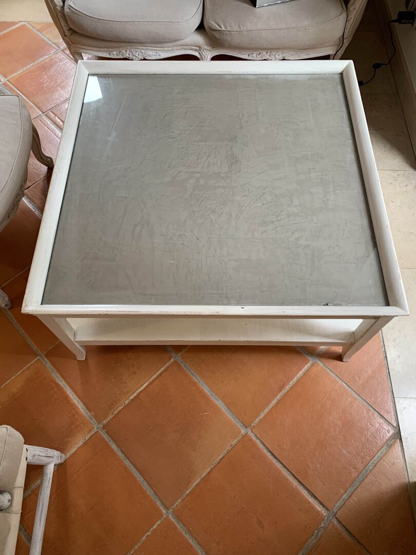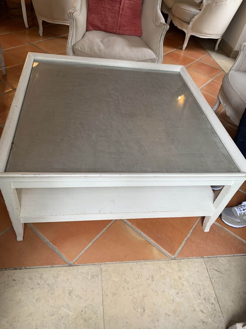Table basse carrée en bois laqué crème et taupe, deux plateaux, 100x100x46 cm