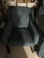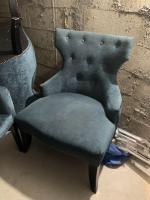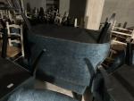 Mobilier de salon garni de velours bleu capitonné comprenant : 11 Fauteuils bleus velours bleu carrés + 4 à oreilles + 2 banquettes à oreilles. Style moderne