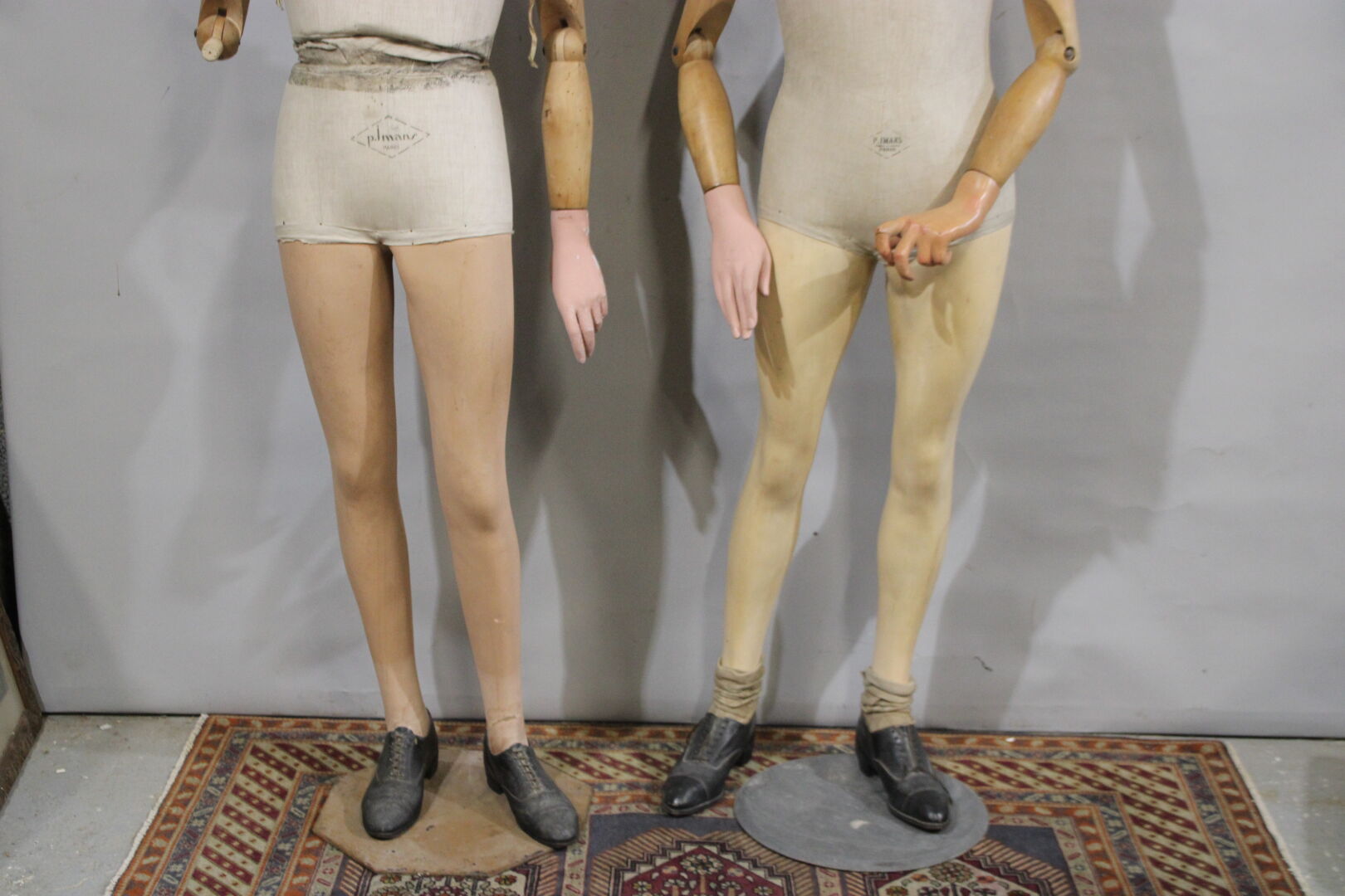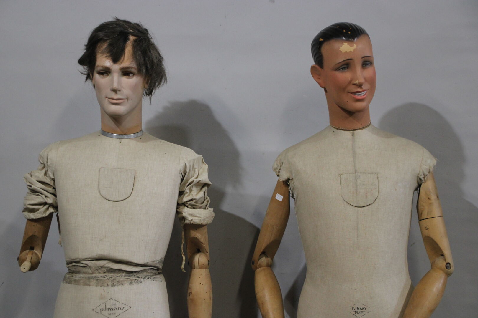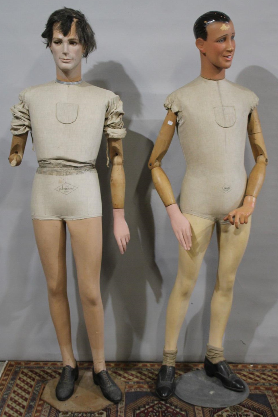 Pierre IMANS: deux anciens mannequins articulés en bois (manques et accidents). H 180 cm