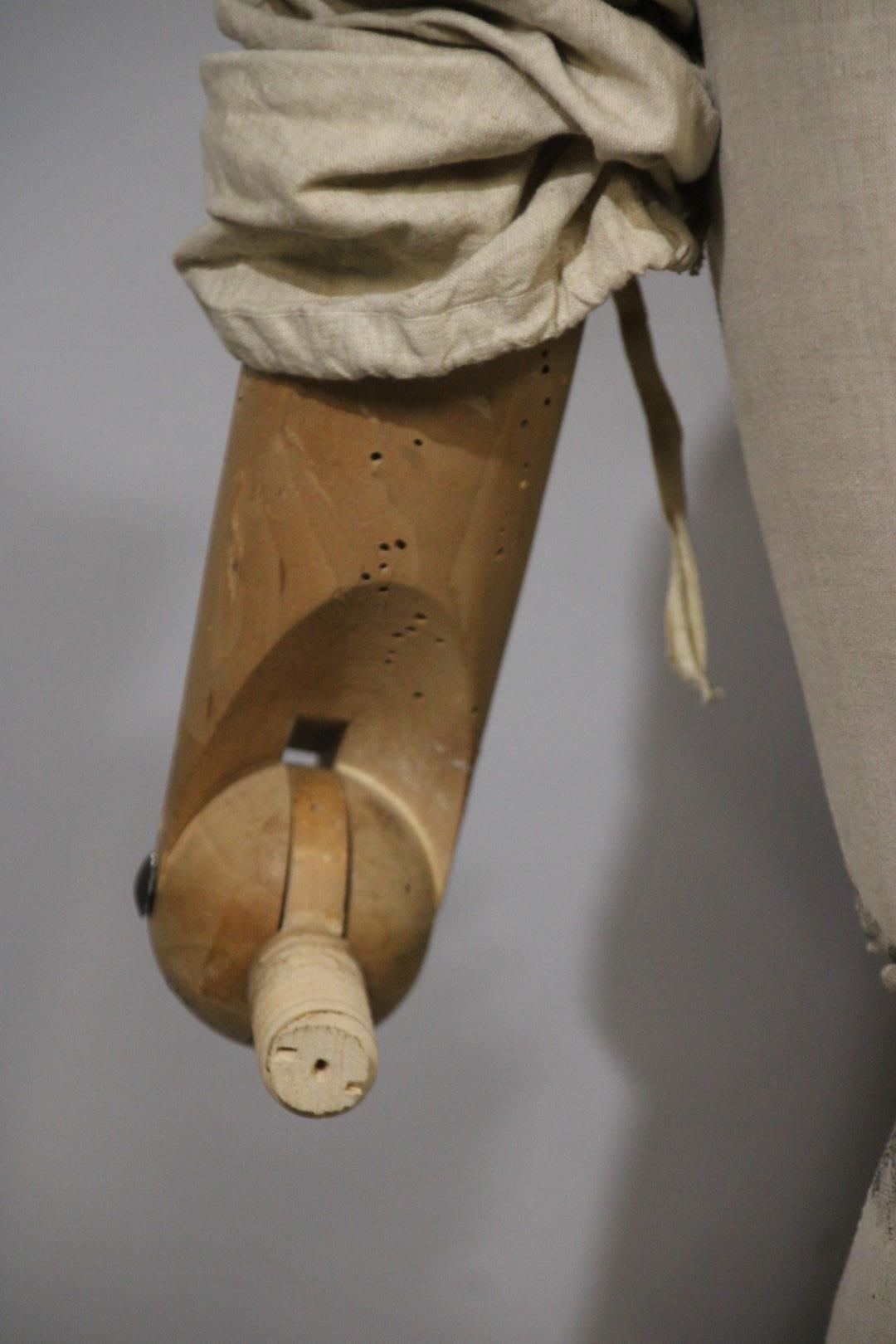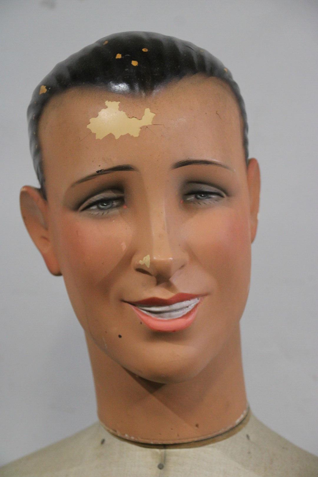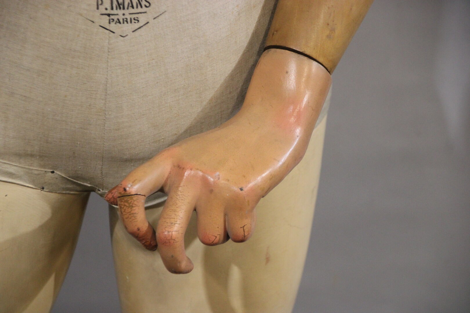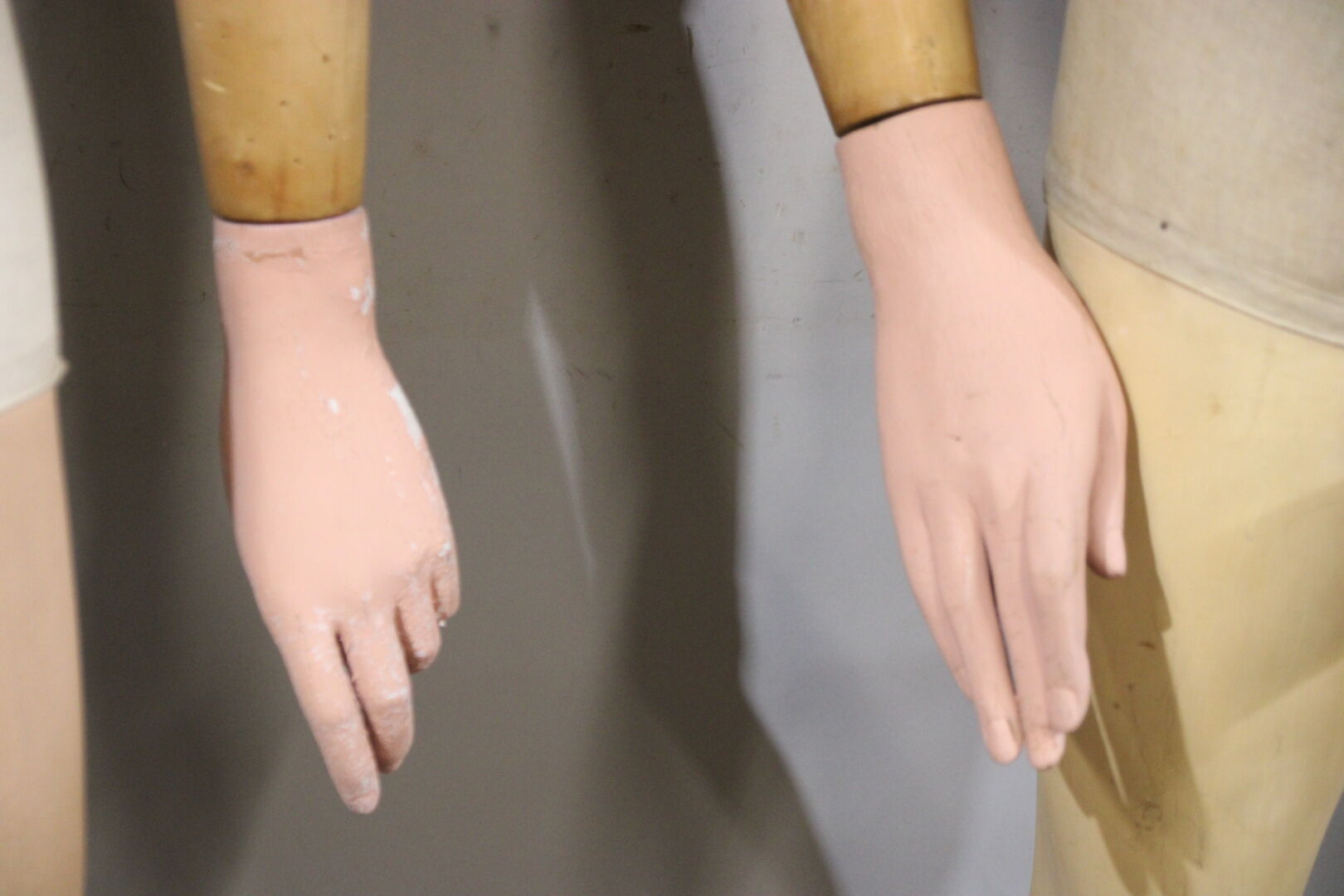 Pierre IMANS: deux anciens mannequins articulés en bois (manques et accidents). H 180 cm