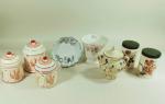 Lot céramique : Jardinière en porcelaine à décor de rose et filet doré, travail anglais moderne, petite assiette en faïence made in Italy, un pot couvert dans le goût de la faïencerie d'Apt et divers (accidents )