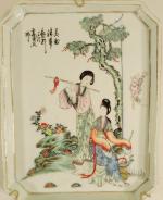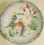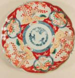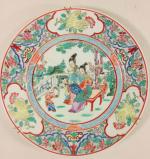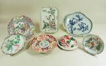 Lot céramique: Assiette décorative famille en porcelaine famille rose, assiette en porcelaine à décor Imari, plat en porcelaine à décor de japonaises à leur toilette, un couvercle en faïence de l'Est et divers (accidents)
