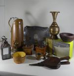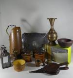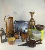 Lot brocante comprenant: Deux moulins à café dont un PEUGEOT frères (état moyen) , un porte-parapluie en cuivre, un vase en laiton à décor repoussé de feuillages , plateau en métal, un oreiller de bain Natures et découvertes (neuf) et divers