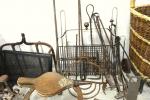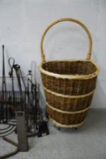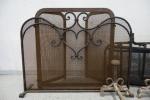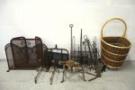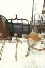 Nécessaire de cheminée comprenant un porte-bûche, deux pare-feux, chenêts, pinces, soufflets, grilles et divers