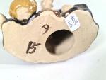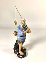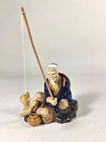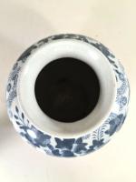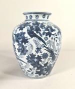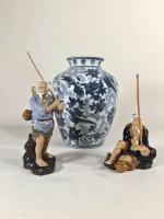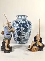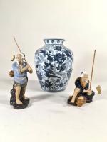 CHINE, Vase en porcelaine à décor bleu sur un fond craquelé d'oiseaux et végétaux, monogramme sous la base, travail moderne H. 26 cm. On y joint 2 figurines de pêcheurs en terre cuite, H. 11 cm et 18 cm