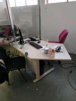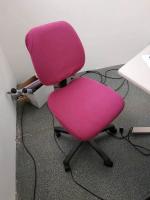 Bureau en mélaminé beige, 2 chaises dactylo en tissu rose, 2 fauteuils visiteur en tissu noir et meuble classeur à tiroirs en plastique