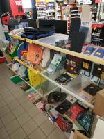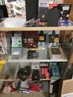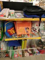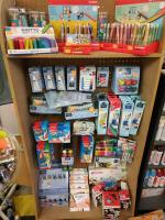 Lot de petites fournitures pour décoration et divers: sacs, cartables, porte photos, transferts, crayons de couleur, gouache, pinceaux et divers, y-compris les vitrines d'exposition