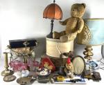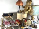 Lot hétéroclyte comprenant une boîte à chapeau et valise en carton, un ours en peluche ancien, une lampe stuqué doré, automate (sans garantie de fonctionnement), chandelier en laiton et divers