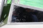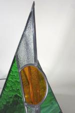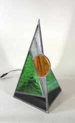 Lampe de salon en vitrail polychrome composée de 4 panneaux montés en pyramide. Coloris : noir, vert, blanc et orange. Signée TEDDY et datée 93. 50x27.5cm