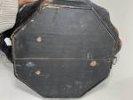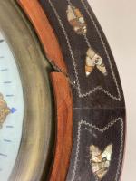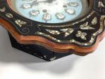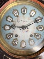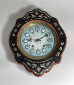 Oeil de boeuf Napoléon III en bois noirci avec incrustation de nacre, le cadran signé (partiellement visible) à fond bleuté. H. 48 cm L. 39 cm P. 14 cm