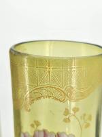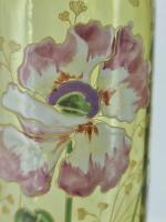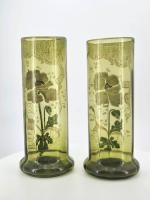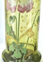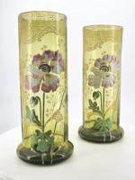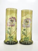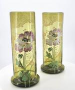 Attribué à LEGRAS : Paire de vases rouleau en verre à décor émaillé de fleurs. H. 27 cm