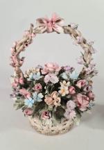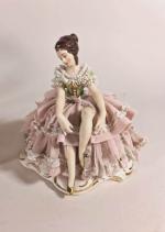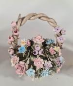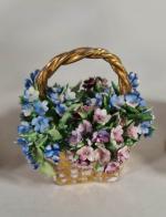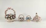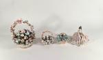 3 corbeilles fleuries en porcelaine de 19, 11 et 9cm, on y joint une danseuse à robe de tulle rose (accidents)