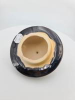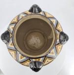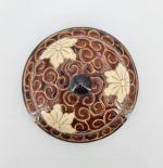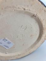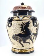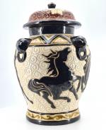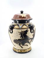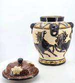 Potiche couverte en terre cuite à décor émaillé de chevaux sur fond beige. Monogrammé sous la base EJ