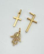 Lot de trois pendentifs en or jaune 750 ml. (18K) deux en forme de croix et un en forme de main de Fatma Poids : 2.1 g. ER