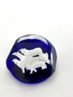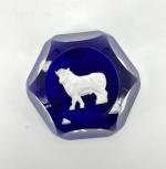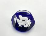BACCARAT : Sulfure presse-papiers taillé à six pontils et fenêtre supérieure, orné d'un Taureau zodiacal en cristallo cérame sur fond bleu, H. 4 cm Diam. 6,3 cm