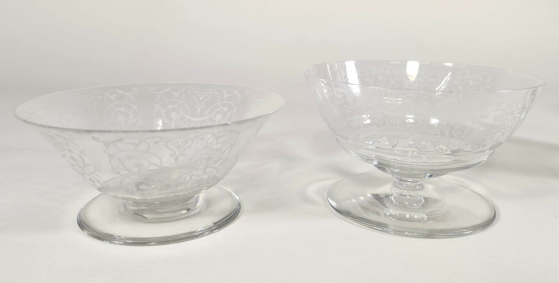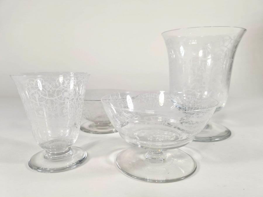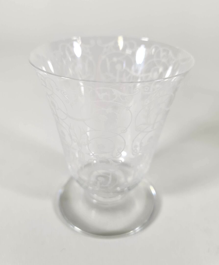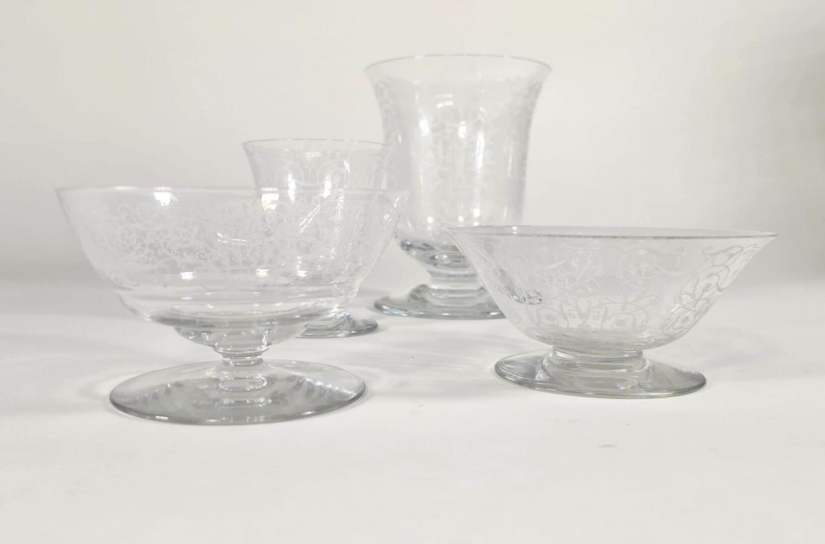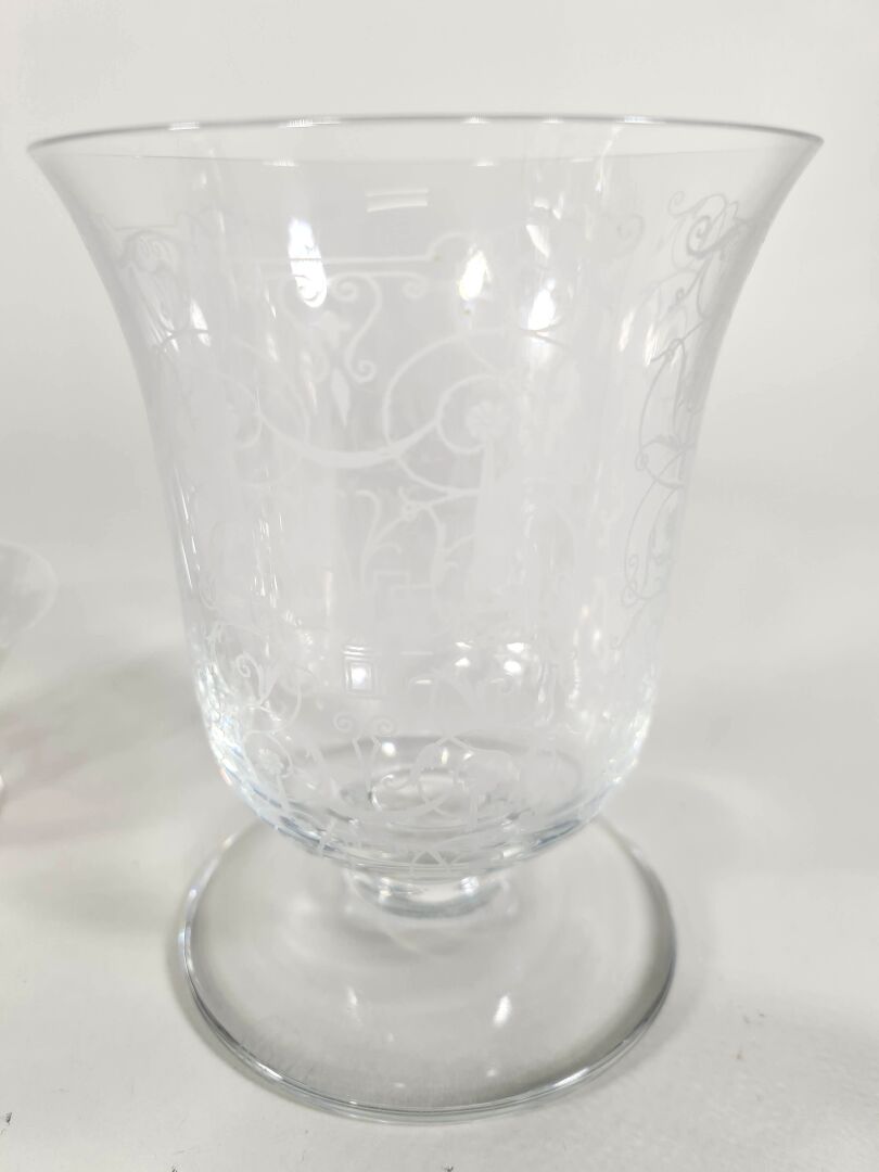 BACCARAT : Modèle "Michelangelo", ensemble en cristal comprenant un photophore, deux coupelles et un verre à décor gravé. H. 13 cm (du plus haut)