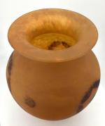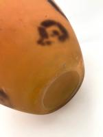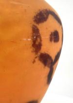 LORRAIN : Vase balustre en pâte de verre orangée et orné et fleurs mauves stylisées. H. 32 cm ; Diam. env. 25 cm.