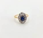 Bague fleur en or 750 millièmes de deux tons sertie d'un saphir ovale(rayé) entouré de diamants de taille ancienne. Poids total : 4.73g (poids or < 3g) TDD 62