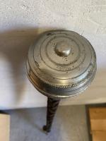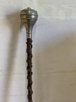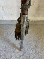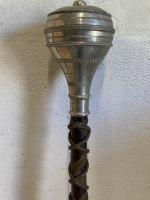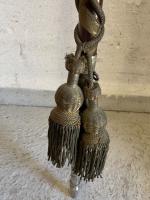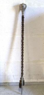 Canne de tambour major, le pommeau en métal à décor ciselé, jonc laqué orné d'un cordon en passementerie terminé par deux glands.