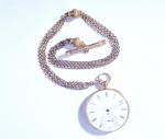 MONTRE de poche à clé en or jaune, le fond gravé d'armes médiévales, échappement à ancre. Poids brut : 59 g ; on y joint une chaîne giletière avec coulant et clé de montre. Poids : 21 g. L'ensemble du 19ème siècle