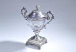 DRAGEOIR en cristal, monture argent, poinçon Minerve, à deux anses volutes, base carrée moulurée sur quatre pieds à volutes, couvercle à prise de main en fruit, époque Restauration. H. 27,5 cm - Poids brut : 912 g