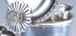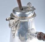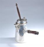 CHOCOLATIÈRE fond plat en argent, poinçon Minerve, bec cannelé et décor de guirlandes, prise de main en grappe sur couvercle pivotant découvrant l'orifice pour la tige du mélangeur. Manche latéral en palissandre tourné, style Louis XVI, époque du 19ème siècle. Poids : 628 g ; on y joint un mélangeur bois