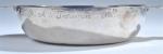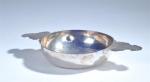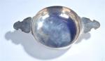 ECUELLE ronde à deux anses découpées et gravées de rinceaux en lambrequin, argent, VANNES ? (1680-1684), époque Louis XIV. L. 27 - Diam. 16 cm - Poids : 260 g. Gravure sur le bord "Me. P. A. TROTEMINARD Nre. A. P.", poinçon de Vannes et deux poinçons de maître orfèvre "IB" encadrant un lion dressé à gauche, couronnés au-dessus d'une hermine (petites restaurations dont déchirures ressoudées au bord des anses, soudures)