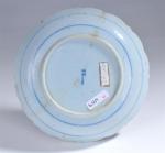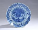 DELFT. Plat creux circulaire à bord dentelé, faïence à décor de "l'arbre à thé" au centre et tertre sur le bord de l'aile, époque du 18ème siècle. Diam. 22,5 cm (égrenures)
