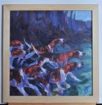 SUSSIN Jean-Yves. "L'hallali du cerf à Bourbansais", acrylique sur panneau monogrammée en bas à droite. 60 x 80 cm