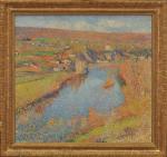 MARTIN Henri (1860-1943). "La vallée du Lot", huile sur toile, porte une trace de signature en bas à droite. 83 x 89 cm (agrandie dans le haut)