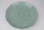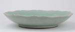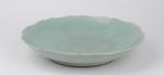 PLAT (grand) à talon bord contour en porcelaine couleur céladon décor de nuée tourbillonnante, Chine époque du 18ème siècle. H. 8,5 - Diam. 42 cm (présence fêle latéral de 5,5 cm, petites égrenures).