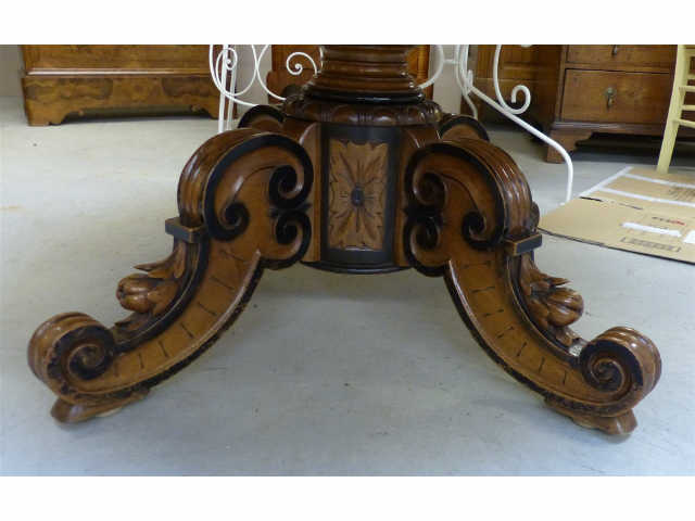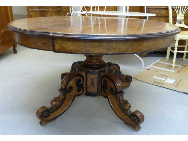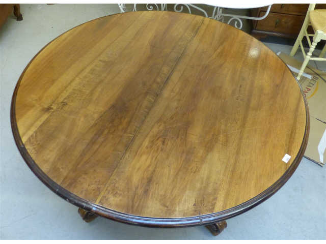 TABLE ronde à rallonges en noyer sur fût tourné balustre sculpté d'acanthes, supportée par quatre pieds volutes, elle présente quatre pieds escamotables sous le plateau. Décor de mouluration noircie. Epoque du 19ème siècle. H. 73 - Diam. 125,5 cm